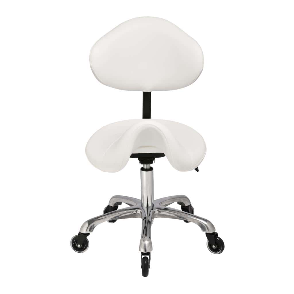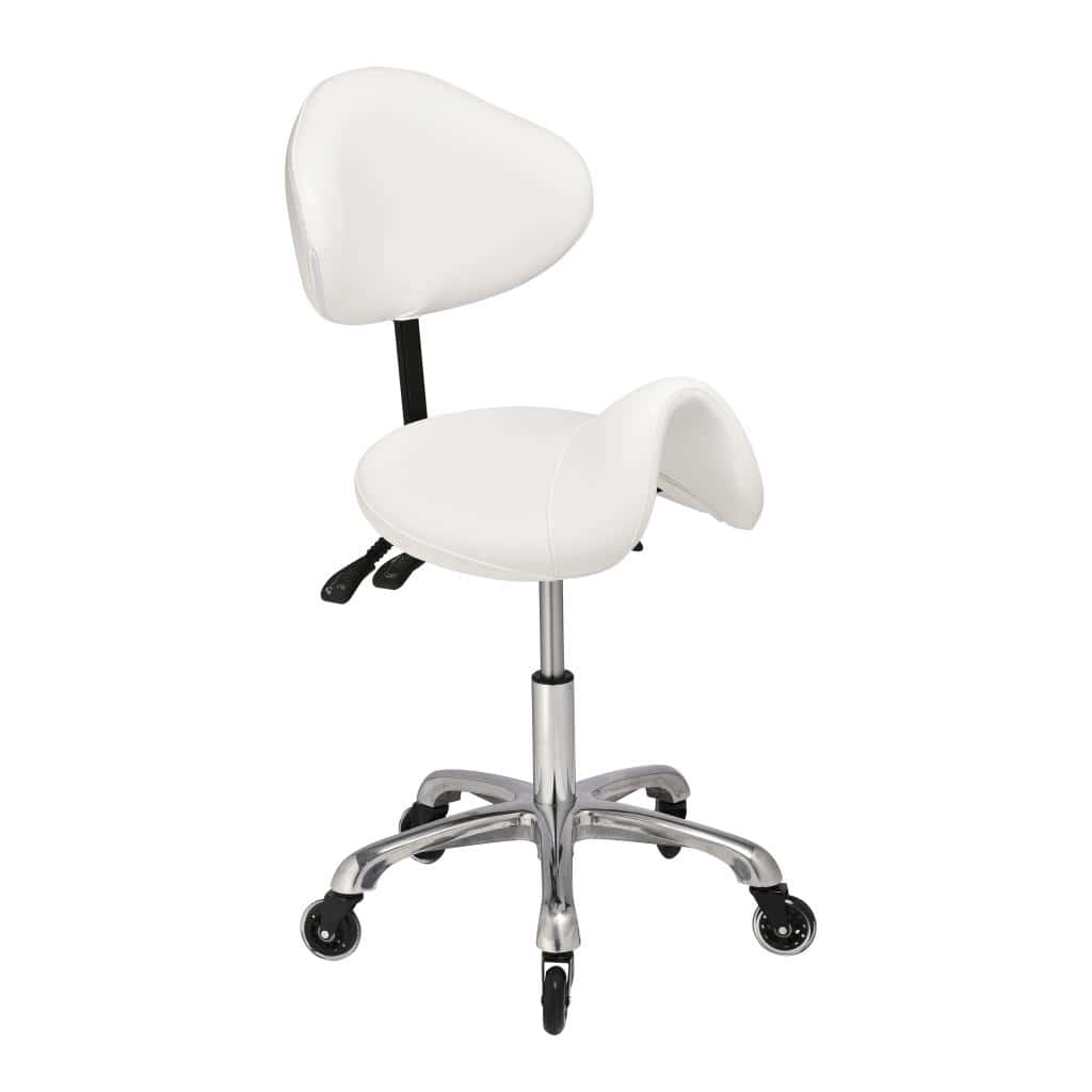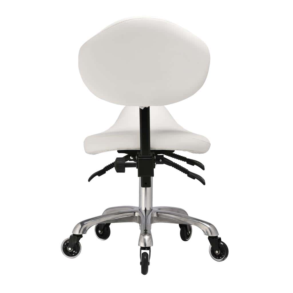 Built on a premium aluminium base for exceptional stability, the Iris features an adjustable contoured backrest and saddle-style seat that naturally align the spine and reduce lower back strain during long treatment sessions.
