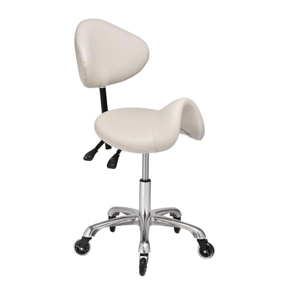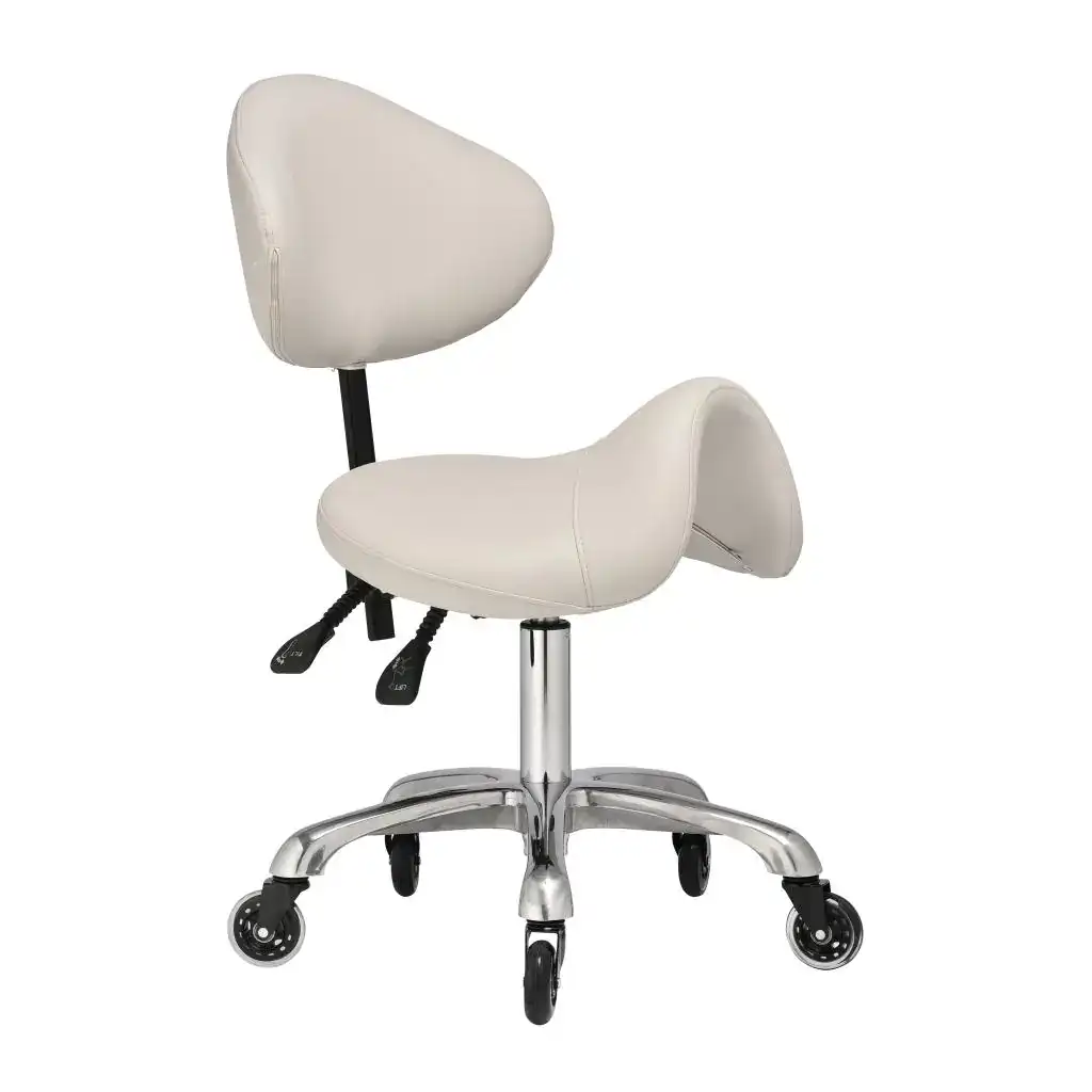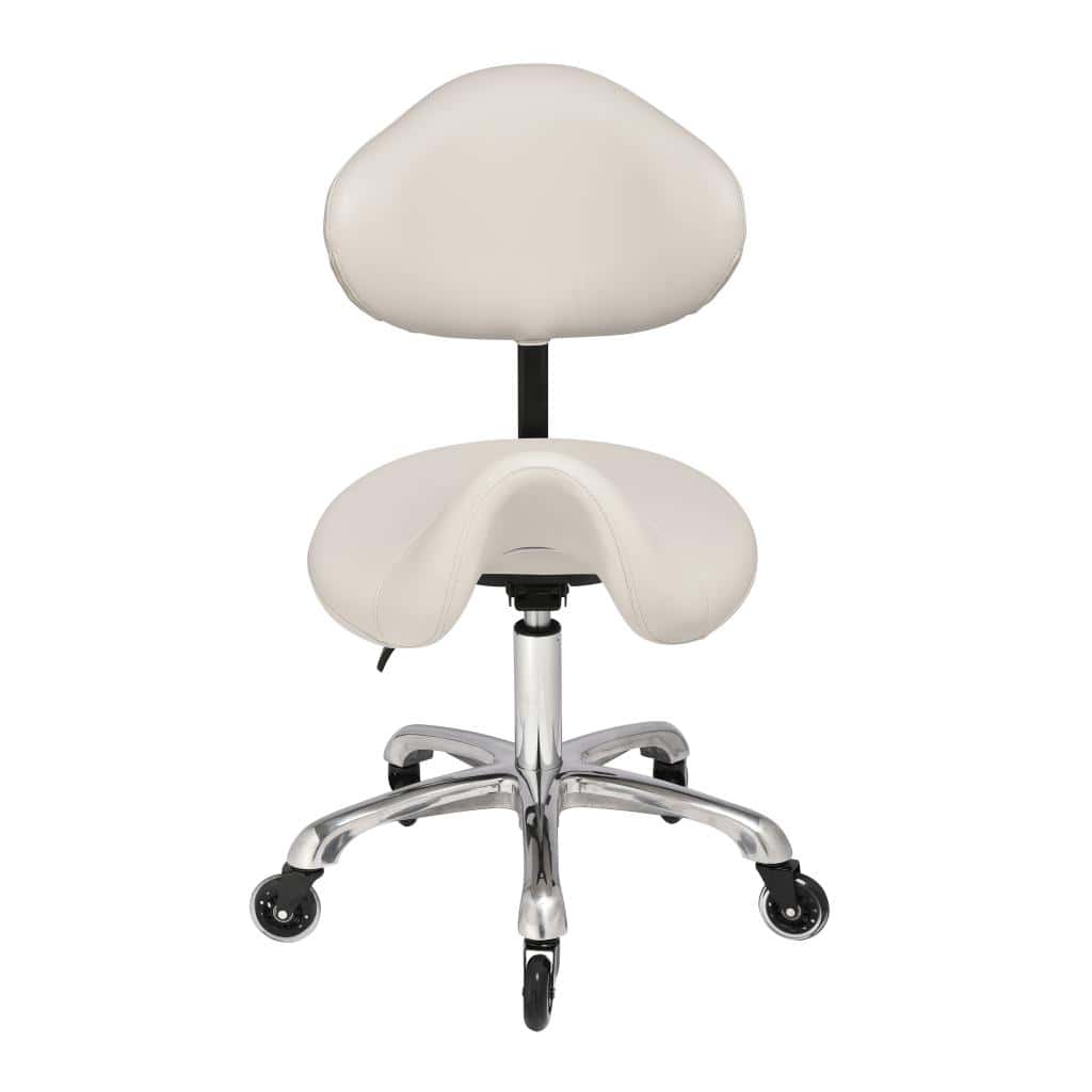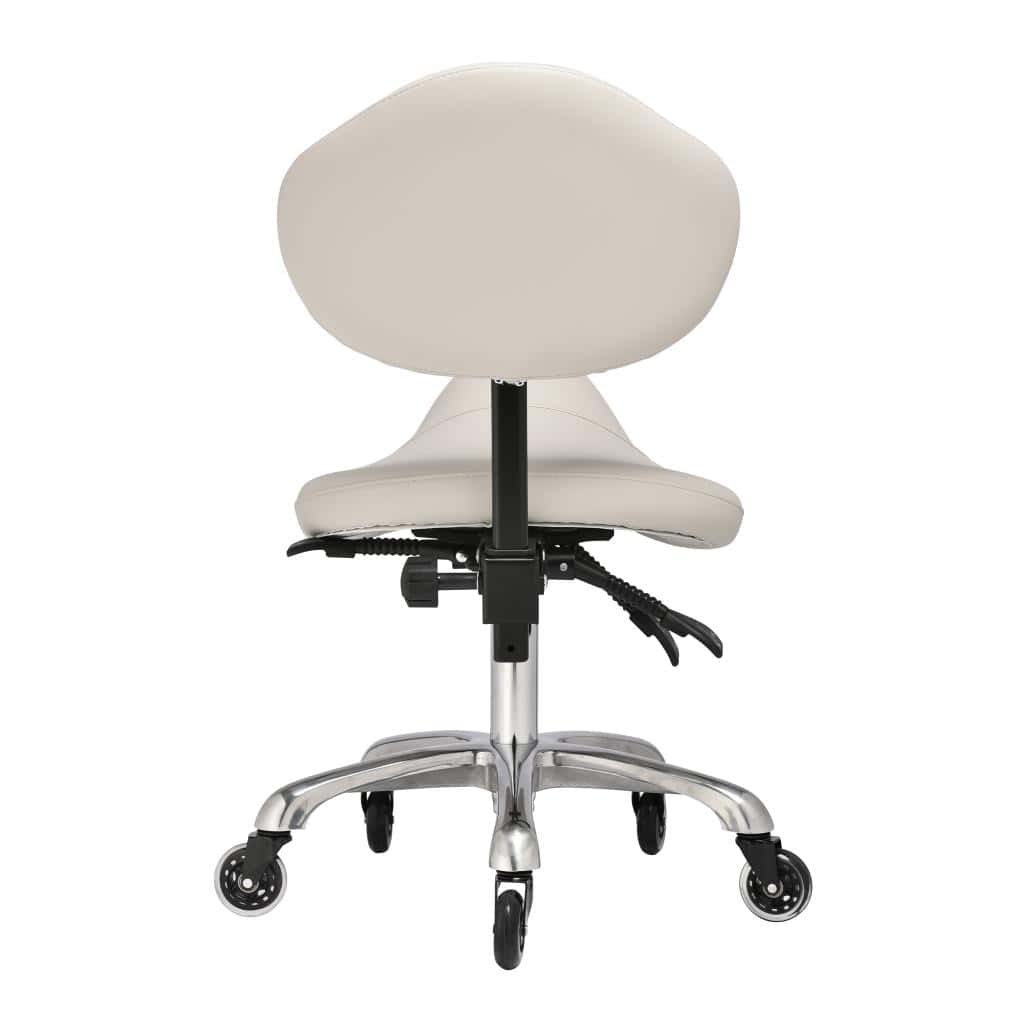 Built on a premium aluminium base for lasting stability, the Iris features an adjustable contoured backrest and a saddle-style seat, promoting natural spinal alignment and reducing lower back strain during extended treatments. Its 75mm professional roller wheels provide smooth, silent gliding across salon and clinical surfaces.